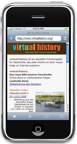 Mit virtual history mobile sind Besitzer von Mobiltelefonen, Blackberrys, iPhones, iPods Touch und PDAs auch unterwegs im Bild. Geben Sie mobil.virtualhistory.org in den Browser Ihres mobilen Endgerätes ein, und Sie erhalten die neue Folge speziell für Ihren Gerätetyp optimiert.